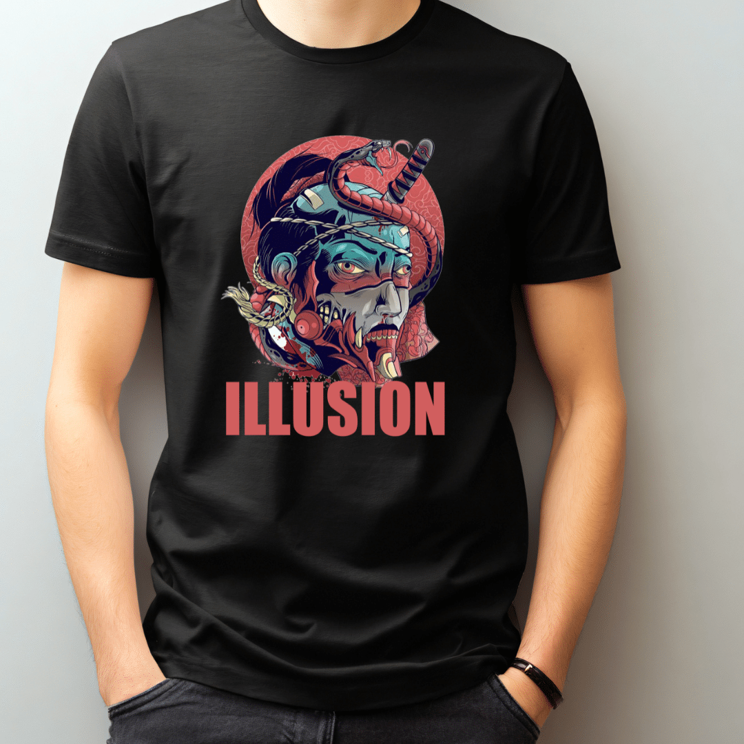 Este modelo presenta una ilustración única que mezcla arte oscuro, estilo samurái futurista y detalles psicodélicos, acompañados del texto ILLUSION en tipografía fuerte y llamativa. Una prenda que destaca por su carácter, detalle y personalidad propia.